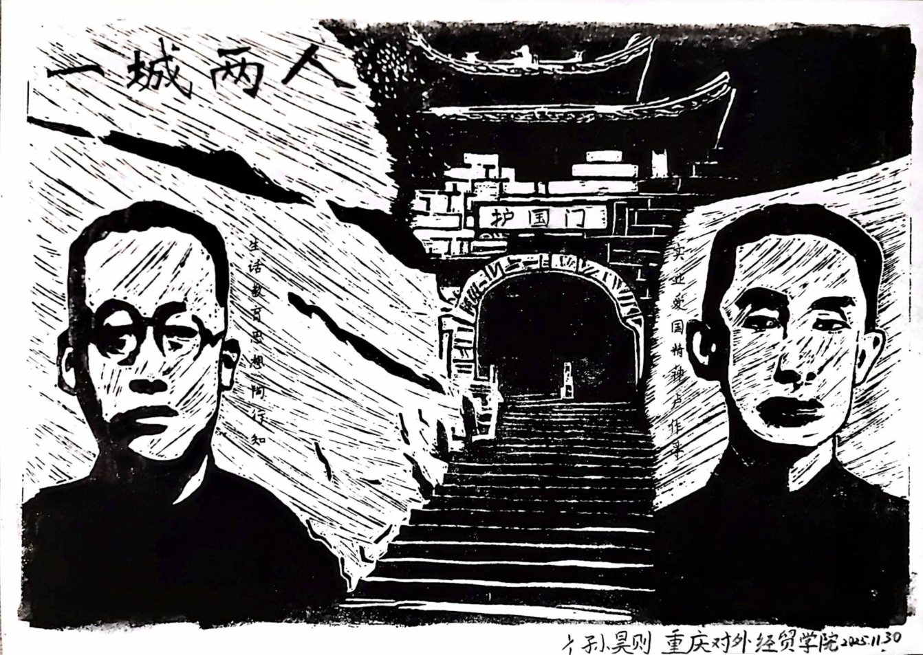 在这幅融合版画艺术风格的作品中,合川地标“护国门”(钓鱼城核心遗存)与“一城两人”文字标识相映成趣,既彰显了钓鱼城作为“上帝折鞭处”的历史厚重感,也暗合了陶行知“生活即教育”、卢作孚“实业救国”的精神底色。将地方文化资源系统性转化为育人资源,是重庆对外经贸学院推进应用型大学建设的有力举措。该校积极推进“一城两人”育人体系,精准锚定三大精神内核并搭建特色承载平台:以钓鱼城遗址为实景课堂,开展沉浸式爱国主义教育,组织学生在古战场研学中感悟家国担当,厚植爱国情怀;依托“行知书院”,深挖陶行知在合川的办学实践底蕴,将其“生活即教育、教学做合一”理念转化为“课堂+社区+乡村”的实践教学模式,推动学生在服务地方治理、乡村振兴的一线践行育人初心;通过“作孚创客学院”,传承卢作孚“服务社会、富强国家”的精神内核,联合京东数字经贸产业学院共建乡村人才创新创业学院,精准对接合川乡村振兴需求,构建“文化认知—专业实践—成果落地”的闭环培养体系,相关成果荣获重庆市人民政府教学成果一等奖。
